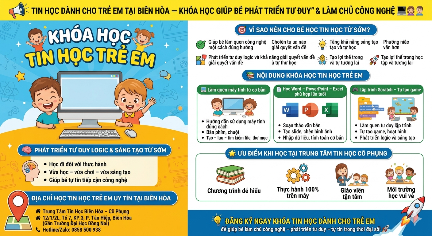 👉 Khóa học Tin học dành cho Trẻ Em tại Trung Tâm Tin Học Biên Hòa – Cô Phụng được thiết kế bài bản, dễ hiểu và phù hợp với học sinh tiểu học.
